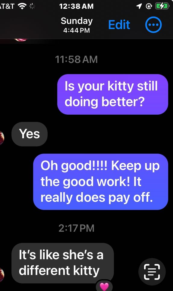 Over the next few days, I checked in with the kitty owner and the cat was making a big turnaround with the regular enrichment playtime activities that the owner was initiating.